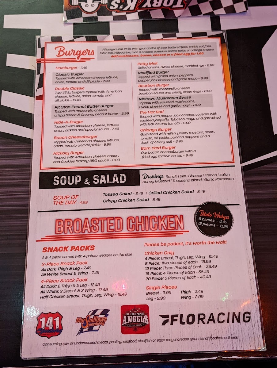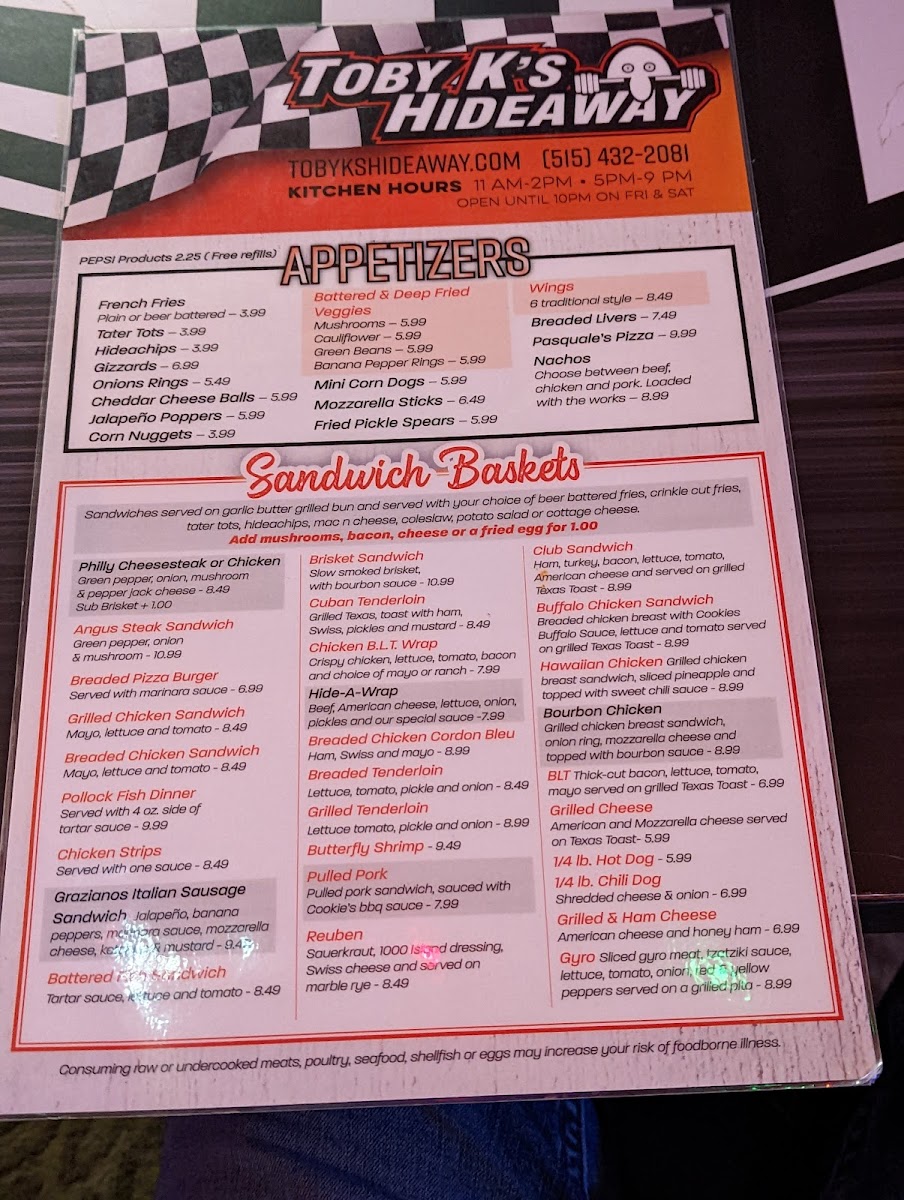 Welcome to Toby K's Hideaway, a charming spot nestled in Boone, Iowa. This vibrant eatery combines a warm, welcoming atmosphere with a menu that’s a feast for the senses. Start your meal with tempting appetizers like crispy Mozzarella Sticks or zesty Fried Pickle Spears. The true stars here are the burgers, offering a range from the classic Hamburger to unique choices like the Pit Stop Peanut Butter Burger and the savory Motown Mushroom Swiss. Each bite invites you to savor the culinary creativity infused into these comfort food staples. For those seeking something lighter, the Grilled Chicken Salad and Soup of the Day provide refreshing options. The friendly staff and racing-themed décor add to the familial vibe. Patrons rave about their experiences, making every visit feel special. Don't miss out on this local treasure!